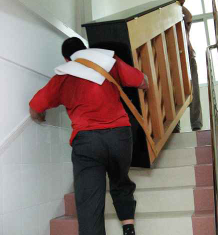 4、如果鋼琴要搬上樓,最好也要有四至五個(gè)人。首先要保證搬琴人的安全,同時(shí)鋼琴不能碰撞、劃蹭,外表的保護(hù)重于內(nèi)部。鋼琴的背面朝墻壁,鍵盤(pán)朝樓梯的扶手。兩人在下,三人在上,最好用寬布帶挎在肩上兜住鋼琴的車(chē)腳。同時(shí)用手抓住琴背的把手和鍵盤(pán)底下(不能拉鋼琴的腿),抬起鋼琴一鼓作氣搬上一層樓再休息。特別要注意的是,鍵盤(pán)的一側(cè)不能碰扶手,車(chē)腳不能碰樓梯。到一層樓面拐彎時(shí)要當(dāng)心碰撞、調(diào)整好方向然后再抬起往上搬。進(jìn)房門(mén)時(shí),也要當(dāng)心蹭著門(mén)框,保證最后安全地把鋼琴放到安排好的位置上。